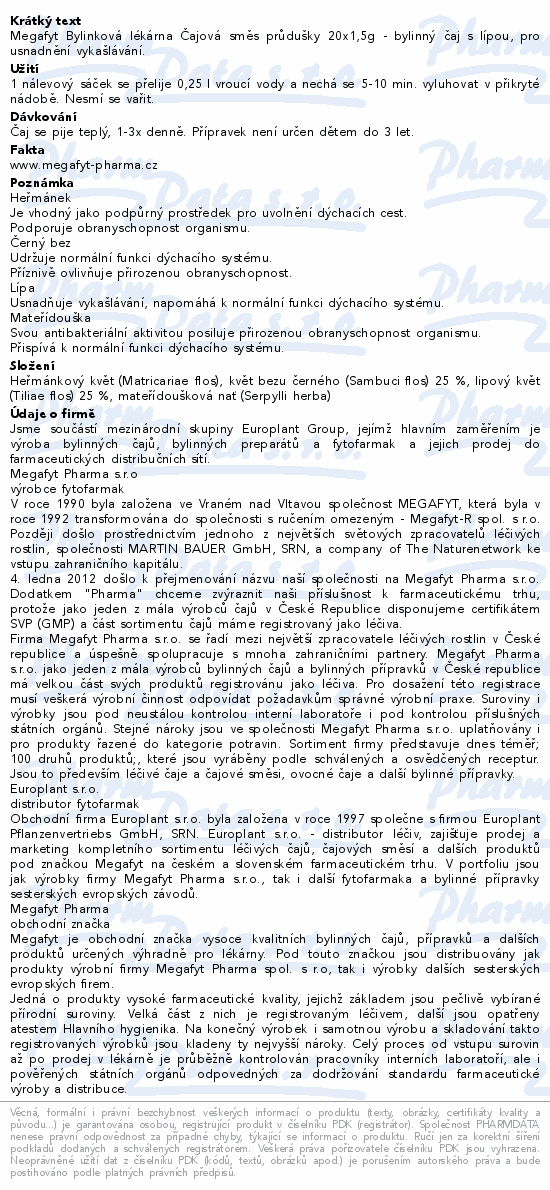 Megafyt Bylinková lékárna Čajová směs průdušky 20x1,5g - bylinný čaj s lípou, pro usnadnění vykašlávání.