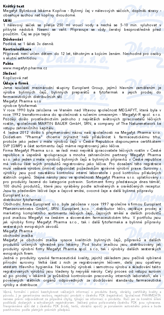 Megafyt Bylinková lékárna Kopřiva - Bylinný čaj v nálevových sáčcích, doplněk stravy - obsahuje suchou nať kopřivy dvoudomé.