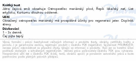 Játra čajová smě obsahuje Ostropestřec mariánský plod, Řepík lékařský nať, List artyčoku, Kurkumu dlouhou oddenek.