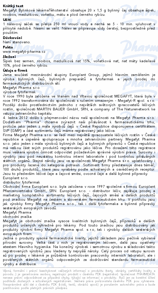 Megafyt Bylinková lékárnaTěhotenství obsahuje 20 x 1,5 g bylinný čaj obsahuje šípek, rooibos, meduňkovu, voňatku, mátu a plod černého rybízu.