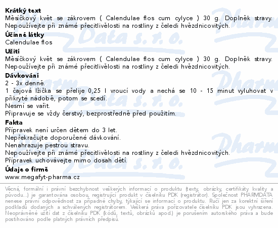 Měsíčkový květ se zákrovem ( Calendulae flos cum cylyce ) 30 g. Doplněk stravy. Nepoužívejte při známé přecitlivělosti na rostliny z čeledi hvězdnicovitých.