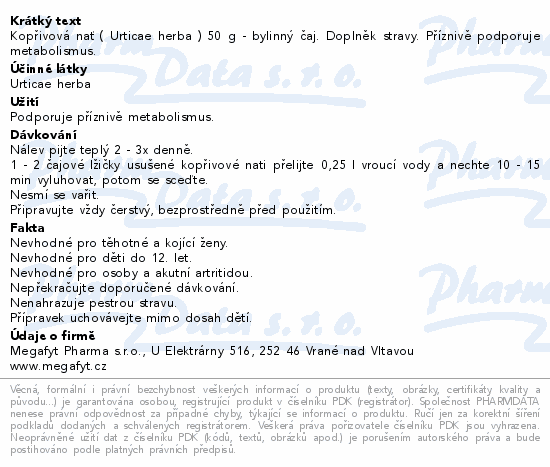 Kopřivová nať ( Urticae herba ) 50 g - bylinný čaj. Doplněk stravy. Příznivě podporuje metabolismus.