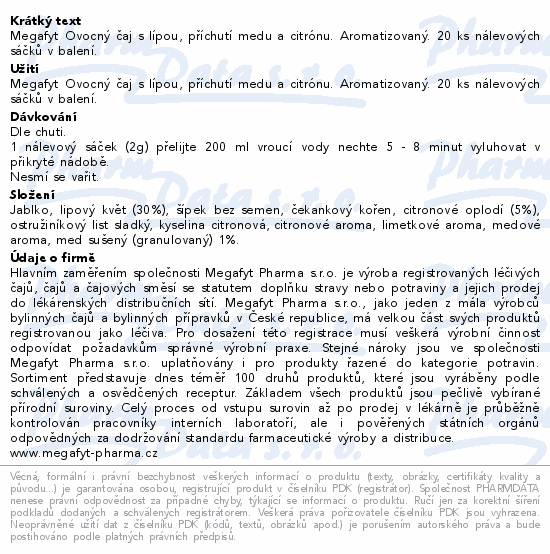 Megafyt Ovocný čaj s lípou, příchutí medu a citrónu. Aromatizovaný. 20 ks nálevových sáčků v balení.