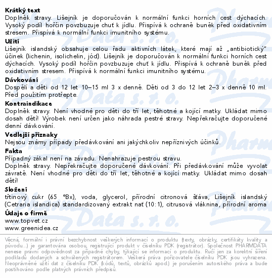 Doplněk stravy. Lišejník je doporučován k normální funkci horních cest dýchacích. Vysoký podíl hořčin povzbuzuje chuť k jídlu. Přispívá k ochraně buněk před oxidativním stresem. Přispívá k normální funkci imunitního systému.