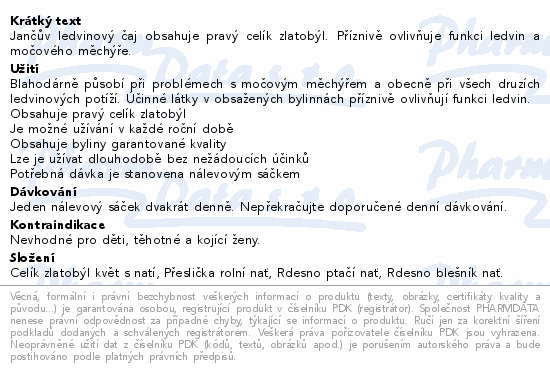 Jančův ledvinový čaj obsahuje pravý celík zlatobýl. Příznivě ovlivňuje funkci ledvin a močového měchýře.