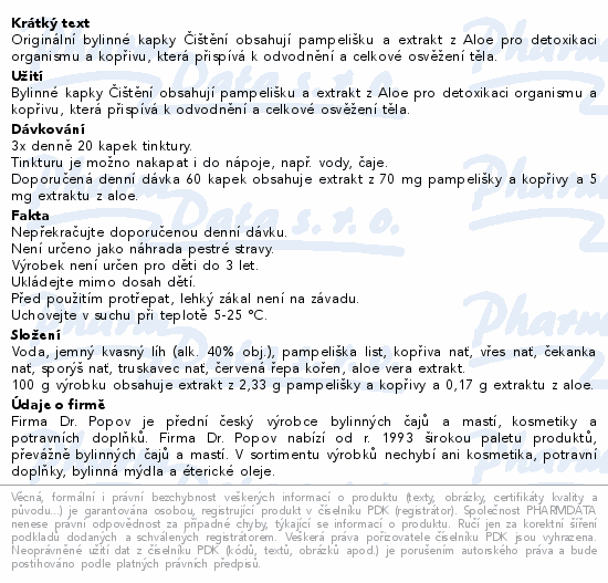 Originální bylinné kapky Čištění obsahují pampelišku a extrakt z Aloe pro detoxikaci organismu a kopřivu, která přispívá k odvodnění a celkové osvěžení těla.