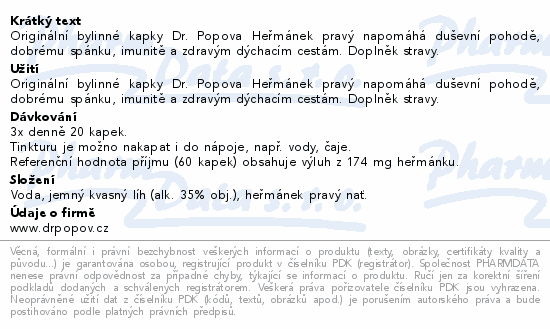 Originální bylinné kapky Dr. Popova Heřmánek pravý napomáhá duševní pohodě, dobrému spánku, imunitě a zdravým dýchacím cestám. Doplněk stravy.