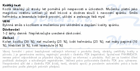 Kozlík lékařský již stovky let pomáhá při nespavosti a úzkostech. Mučenku pletní jako magickou rostlinu uctívali již staří Inkové a dodnes slouží k navození spánku. Směs heřmánku a levandule krásně provoní, uklidní a zrelaxuje Vaši mysl.