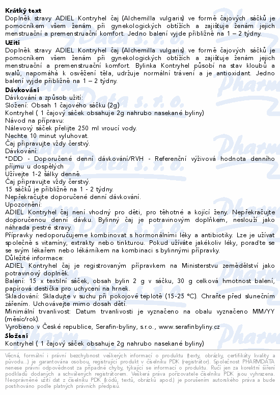 Doplněk stravy ADIEL Kontryhel čaj (Alchemilla vulgaris) ve formě čajových sáčků je pomocníkem všem ženám při gynekologických obtížích a zajišťuje ženám jejich menstruační a premenstruační komfort. Jedno balení vyjde přibližně na 1 – 2 týdny.