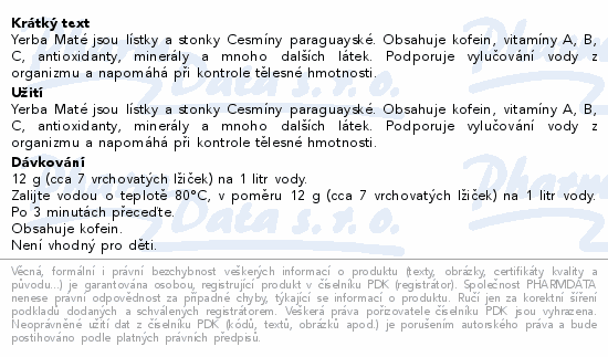 Yerba Maté jsou lístky a stonky Cesmíny paraguayské. Obsahuje kofein, vitamíny A, B, C, antioxidanty, minerály a mnoho dalších látek. Podporuje vylučování vody z organizmu a napomáhá při kontrole tělesné hmotnosti.