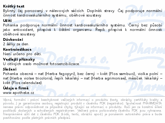 Apotheke Čaj na žíly s pohankou je bylinný čaj ve formě nálevových sáčků, který obsahuje směs bylin tradičně využívaných pro podporu normální funkce cévního systému - pohanka obecná, bez černý, violka polní, řepík lékařský a měsíček lékařský.