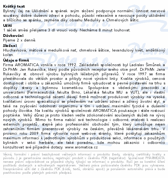 Bylinný čaj na Uklidnění a spánek svým složení podporuje normální činnost nervové soustavy, dobré duševní zdraví a pohodu, působí relaxačně a navozuje pocity uklidnění a blížícího se spánku, zejména díky obsahu Meduňky a Chmelových šištic.