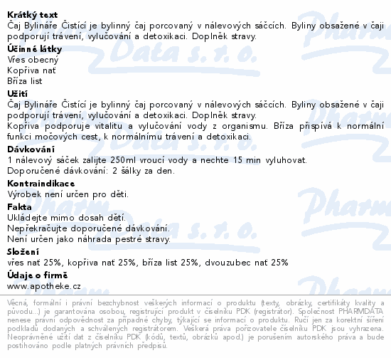 Čaj Bylináře Čistící je bylinný čaj porcovaný v nálevových sáčcích. Byliny obsažené v čaji podporují trávení, vylučování a detoxikaci. Doplněk stravy.