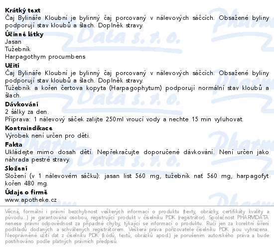 Čaj Bylináře Kloubní je bylinný čaj porcovaný v nálevových sáčcích. Obsažené byliny podporují stav kloubů a šlach. Doplněk stravy.