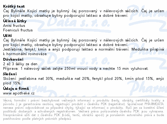Čaj Bylináře Kojící matky je bylinný čaj porcovaný v nálevových sáčcích. Čaj je určen pro kojící matky, obsahuje byliny podporující laktaci a dobré trávení.