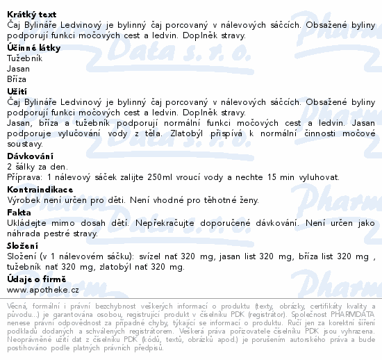 Čaj Bylináře Ledvinový je bylinný čaj porcovaný v nálevových sáčcích. Obsažené byliny podporují funkci močových cest a ledvin. Doplněk stravy.