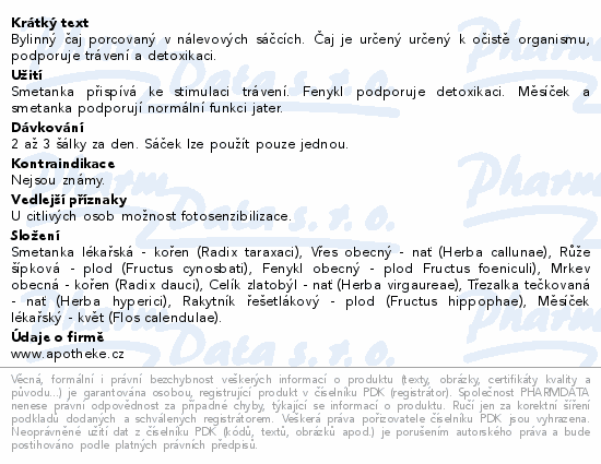 Bylinný čaj porcovaný v nálevových sáčcích. Čaj je určený určený k očistě organismu, podporuje trávení a detoxikaci.