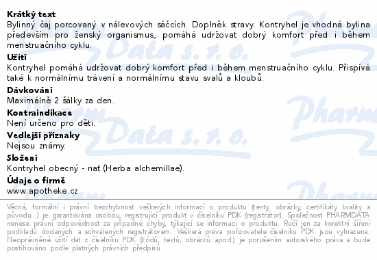 Bylinný čaj porcovaný v nálevových sáčcích. Doplněk stravy. Kontryhel je vhodná bylina především pro ženský organismus, pomáhá udržovat dobrý komfort před i během menstruačního cyklu.