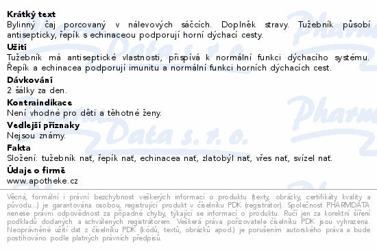 Bylinný čaj porcovaný v nálevových sáčcích. Doplněk stravy. Tužebník působí antisepticky, řepík s echinaceou podporují horní dýchací cesty.
