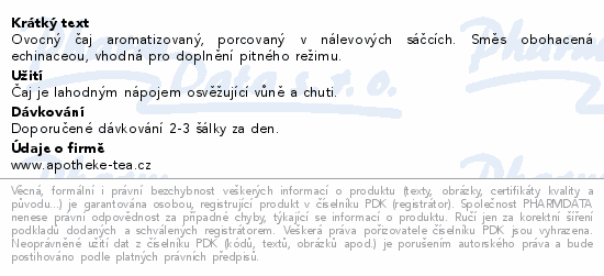 Ovocný čaj aromatizovaný, porcovaný v nálevových sáčcích. Směs obohacená echinaceou, vhodná pro doplnění pitného režimu.