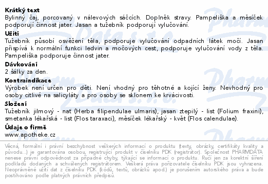 Bylinný čaj, porcovaný v nálevových sáčcích. Doplněk stravy. Pampeliška a měsíček podporují činnost jater. Jasan a tužebník podporují vylučování.