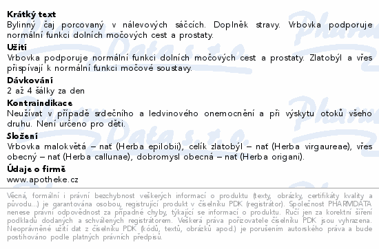 Bylinný čaj porcovaný v nálevových sáčcích. Doplněk stravy. Vrbovka podporuje normální funkci dolních močových cest a prostaty.