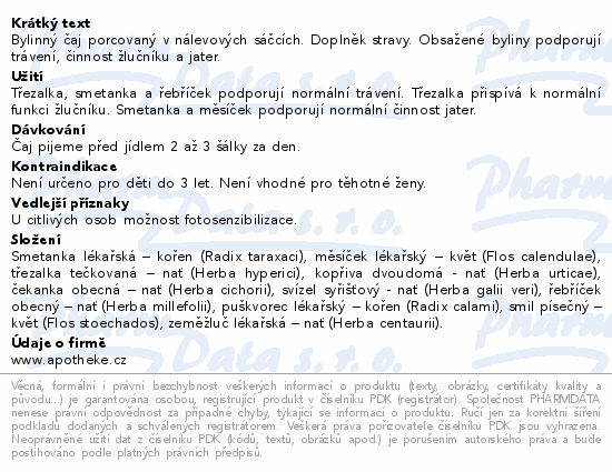 Bylinný čaj porcovaný v nálevových sáčcích. Doplněk stravy. Obsažené byliny podporují trávení, činnost žlučníku a jater.