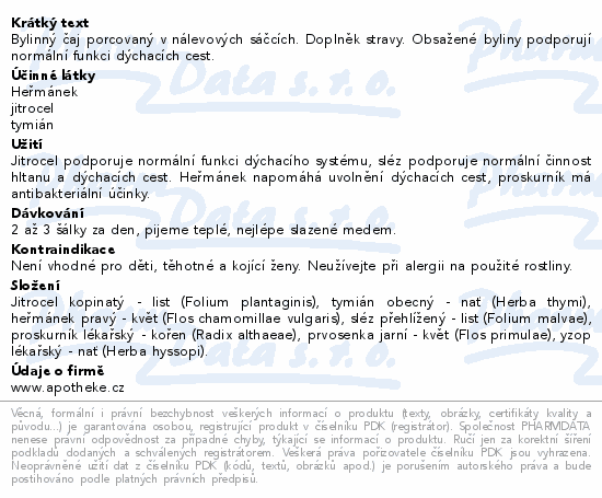 Bylinný čaj porcovaný v nálevových sáčcích. Doplněk stravy. Obsažené byliny podporují normální funkci dýchacích cest.