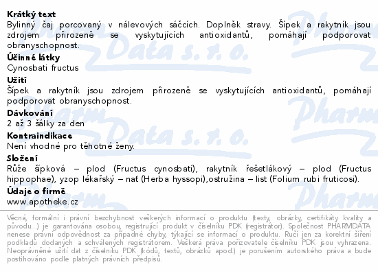 Bylinný čaj porcovaný v nálevových sáčcích. Doplněk stravy. Šípek a rakytník jsou zdrojem přirozeně se vyskytujících antioxidantů, pomáhají podporovat obranyschopnost.