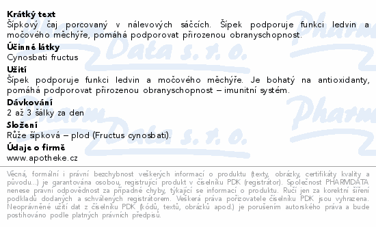 Šípkový čaj porcovaný v nálevových sáčcích. Šípek podporuje funkci ledvin a močového měchýře, pomáhá podporovat přirozenou obranyschopnost.