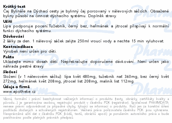 Čaj Bylináře na Dýchací cesty je bylinný čaj porcovaný v nálevových sáčcích. Obsažené byliny působí na činnost dýchacího systému. Doplněk stravy.