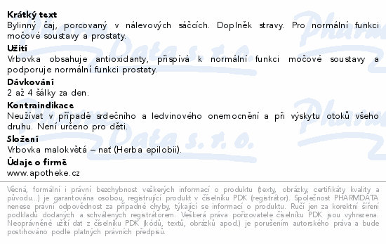 Bylinný čaj, porcovaný v nálevových sáčcích. Doplněk stravy. Pro normální funkci močové soustavy a prostaty.