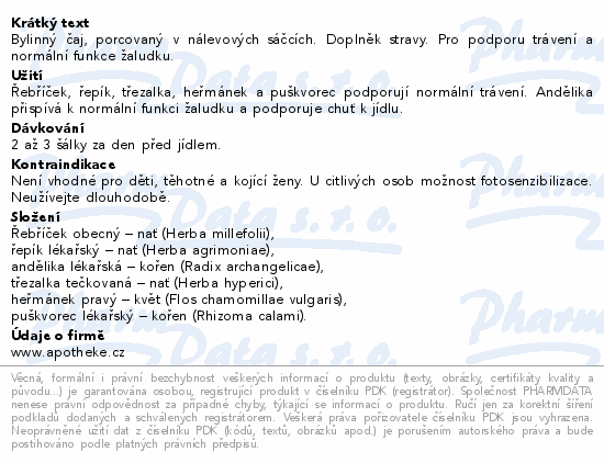 Bylinný čaj, porcovaný v nálevových sáčcích. Doplněk stravy. Pro podporu trávení a normální funkce žaludku.