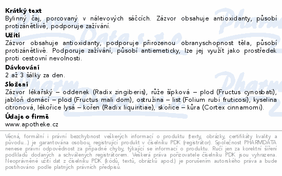 Bylinný čaj, porcovaný v nálevových sáčcích. Zázvor obsahuje antioxidanty, působí protizánětlivě, podporuje zažívání.