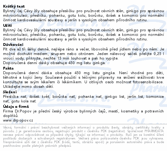Bylinný čaj Cévy žíly obsahuje přesličku pro pružnost cévních stěn, ginkgo pro správnou mikrocirkulaci, přesličku, pohanku, gotu kolu, borůvku, ibišek a komonici pro normální činnost kardiovaskulární soustavy a jerlín s vysokým obsahem přírodního rutinu.