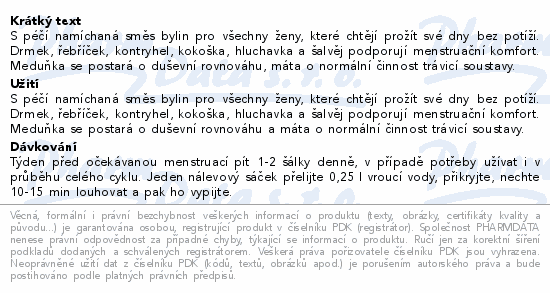 S péčí namíchaná směs bylin pro všechny ženy, které chtějí prožít své dny bez potíží. Drmek, řebříček, kontryhel, kokoška, hluchavka a šalvěj podporují menstruační komfort. Meduňka se postará o duševní rovnováhu, máta o normální činnost trávicí soustavy.