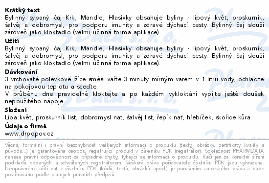 Bylinný sypaný čaj Krk, Mandle, Hlasivky obsahuje byliny - lipový květ, proskurník, šalvěj a dobromysl, pro podporu imunity a zdravé dýchací cesty. Bylinný čaj slouží zároveň jako kloktadlo (velmi účinná forma aplikace).