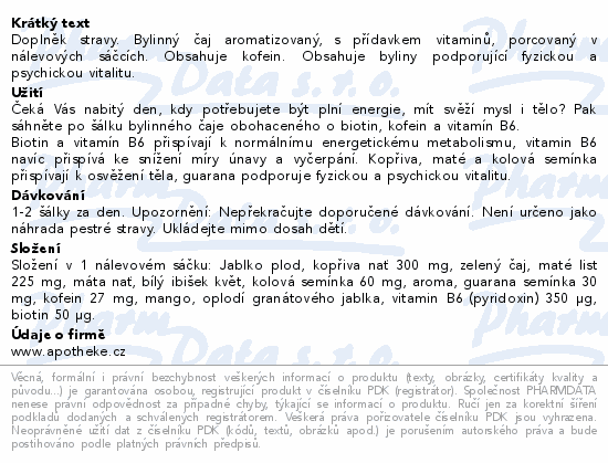 Doplněk stravy. Bylinný čaj aromatizovaný, s přídavkem vitaminů, porcovaný v nálevových sáčcích. Obsahuje kofein. Obsahuje byliny podporující fyzickou a psychickou vitalitu.