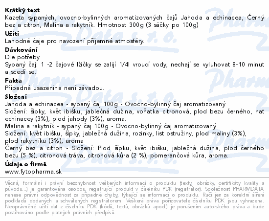 Kazeta sypaných, ovocno-bylinných aromatizovaných čajů Jahoda a echinacea, Černý bez a citron, Malina a rakytník. Hmotnost 300g (3 sáčky po 100g)