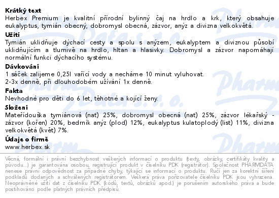 Herbex Premium je kvalitní přírodní bylinný čaj na hrdlo a krk, který obsahuje eukalyptus, tymián obecný, dobromysl obecná, zázvor, anýz a divizna velkokvětá.