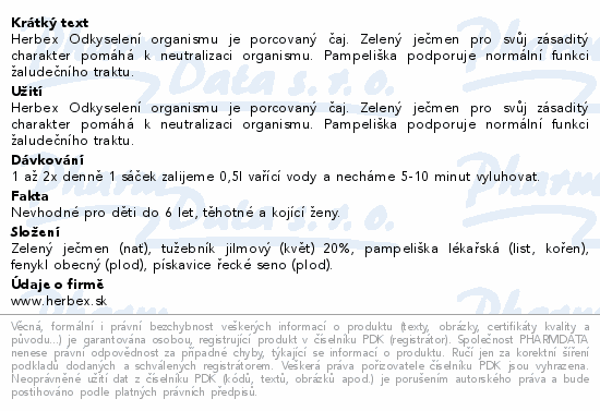 Herbex Odkyselení organismu je porcovaný čaj. Zelený ječmen pro svůj zásaditý charakter pomáhá k neutralizaci organismu. Pampeliška podporuje normální funkci žaludečního traktu.