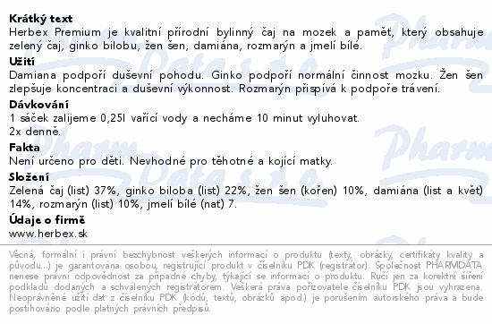 Herbex Premium je kvalitní přírodní bylinný čaj na mozek a paměť, který obsahuje zelený čaj, ginko bilobu, žen šen, damiána, rozmarýn a jmelí bílé.