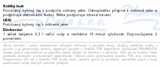 Porcovaný bylinný čaj k podpoře ochrany jater. Ostropestřec přispívá k ochraně jater a podporuje detoxikační funkci. Máta podporuje zdravé trávení.