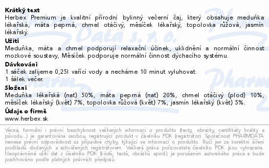 Herbex Premium je kvalitní přírodní bylinný večerní čaj, který obsahuje meduňka lékařská, máta peprná, chmel otáčivý, měsíček lékařský, topolovka růžová, jasmín lékařský.