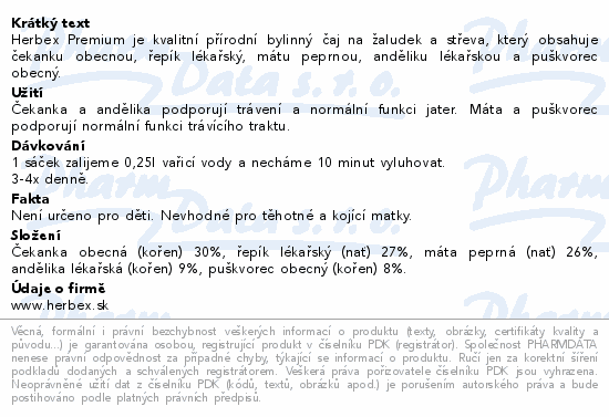 Herbex Premium je kvalitní přírodní bylinný čaj na žaludek a střeva, který obsahuje čekanku obecnou, řepík lékařský, mátu peprnou, anděliku lékařskou a puškvorec obecný.