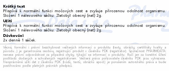 Přispívá k normální funkci močových cest a zvyšuje přirozenou odolnost organismu. Složení 1 nálevového sáčku: Zlatobýl obecný (nať) 2g.