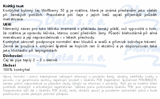 Kontryhel bylinný čaj Wolfberry 50 g je rostlina, která je známá především jako všelék při ženských potížích. Pravidelné pití čaje z jejích listů zajistí příjemější průběh menstruace.