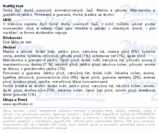 Směs čtyř druhů ovocných aromatizovaných čajů: Malina a jahoda, Mandarinka a granátové jablko, Pomeranč a guarana, Horká švestka se skořicí.