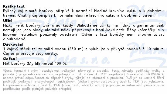 Bylinný čaj z natě borůvky přispívá k normální hladině krevního cukru a k dobrému trávení. Chutný čaj přispívá k normální hladině krevního cukru a k dobrému trávení.