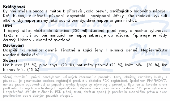 Bylinná směs s bucco a mátou k přípravě „cold brew“, osvěžujícího ledového nápoje. Keř bucco, z něhož původní obyvatelé jihozápadní Afriky Khoikhoiové vyvinuli alkoholický nápoj známý jako buchu brandy, dává nápoji originální chuť.
